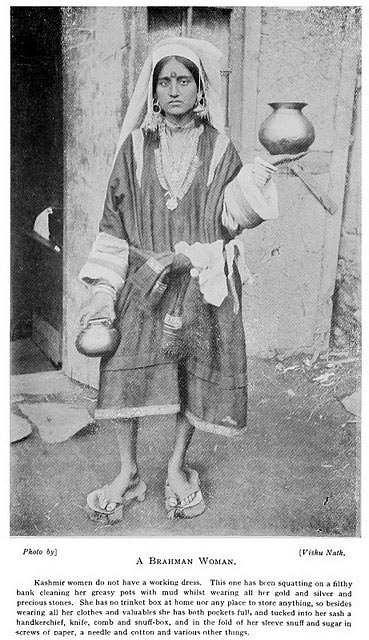 Kashmir women do not have a working dress. This one has been squatting on a filthy bank cleaning her greasy pots with mud whilst wearing all her gold and silver and precious stones. She has no trinket box at home nor any place to store anything, so besides wearing all her clothes and valuables she has both pockets full, and tucked into her sash a handkerchief, knife, comb and snuff-box, and in the fold of her sleeves snuff and sugar in screws of paper, a needle and cotton and various other things.